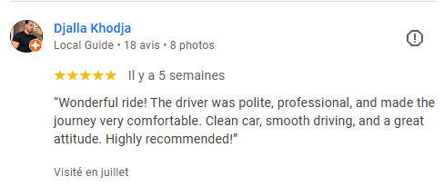 Nous offrons un tarif transparent, fixé à l’avance, sans surprise, même en cas de retard ou d’embouteillage. Aucun supplément n’est appliqué, pour une tranquillité d’esprit totale.